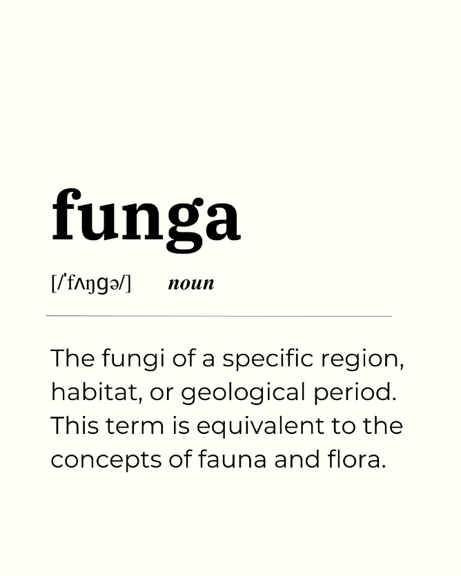 Image courtesy of Fungi Foundation. Image description: Dictionary definition text of the word ‘funga’ (noun): The fungi of a specific region, habitat, or geological period. This term is equivalent to the concepts of fauna and flora.